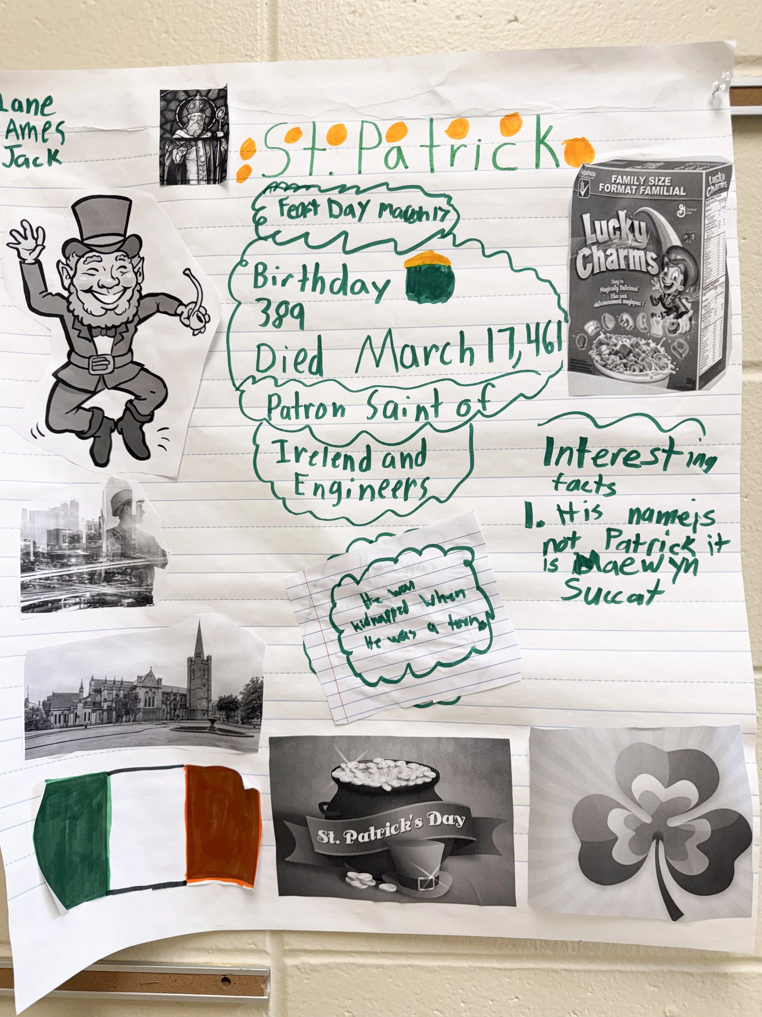 All students, grades, K-6, are divided into multi-aged groups led by a sixth grader. Serving as All School Project leaders is one of the highlights of the sixth grade year at St. Malachy, allowing for growth and development of communication skills and leadership qualities.
