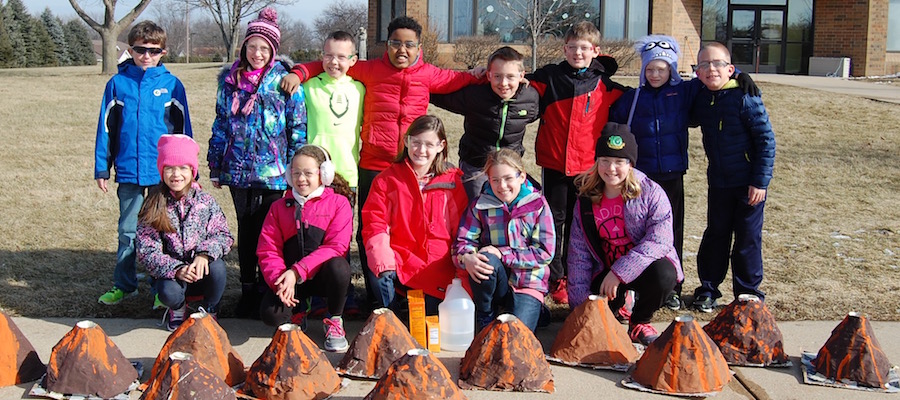 After studying volcanoes in science class third grade constructed their own volcanic mountains out of Pringles cans and paper mache. Students erupted with enthusiasm for science as they watched the chemical reaction that occurs when mixing baking soda and vinegar!
